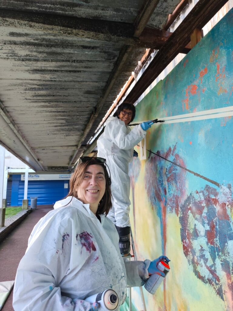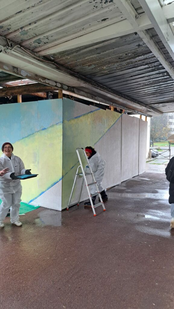 Ce projet a permis aux participantes de se confronter à un format mural XXL (35 m²), rarement abordé en cours, de découvrir les contraintes de la peinture en extérieur et de partager un moment artistique ouvert à tous.